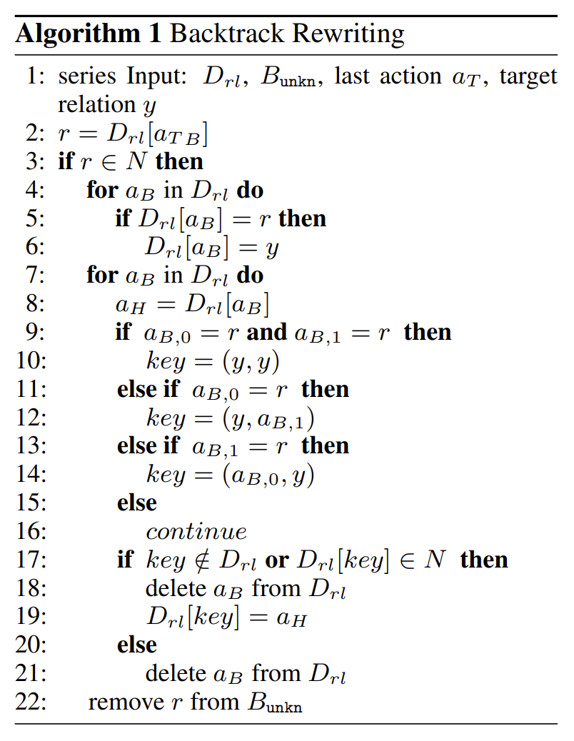 在训练中,当一个 episode 结束时,检查最终得到的关系是否和数据中的答案一致,若不一致,则需要根据答案更新记忆区,更新方法如下算法 1 所示。举例来说,如果模型给出要预测的关系是一个 invented 关系 u,而实际训练数据指向一个已知的关系 r6,则记忆区中的所有 u 都会被替换为 r6,下次再查找的时候,模型就知道这条规则的关系组合应该被合并为 r6。