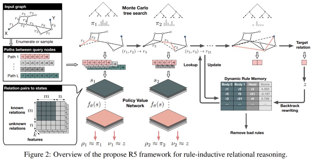 R5 系统性强,对噪声数据具有稳健性。它由配备蒙特卡罗树搜索(MCTS)的策略价值网络执行循环关系预测,并由用于规则挖掘的回溯重写(Backtrack Rewritting)机制组成。通过交替地应用这两个组件,R5 逐步从数据中学习一组显式规则,并执行可解释和可概括的关系预测。