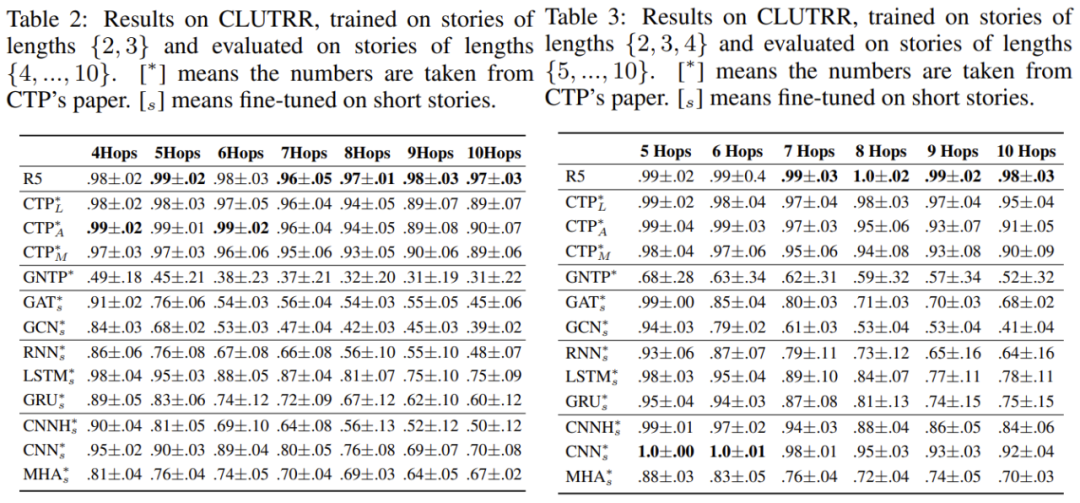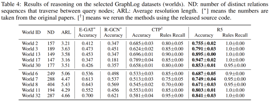 在 CLUTRR 和 GraphLog 数据集上,R5 均取得了 SOTA 的表现,其中 CLUTRR 的数据较为干净,而 GraphLog 则包含较多错误数据。可以看到,R5 可以在非常小的数据上进行训练(每张图仅包含 2~4 个 node),却可以将学习到的规则泛化到较大的图上,它们的推理路径可能长达 15 步。值得一提的是,GraphLog 数据集给出了生成每个小数据集所用到的规则,虽然在训练时不使用这些信息,但可以用其验证模型对规则提取的召回率,R5 在大部分实验的数据集上可达到接近 100% 的召回率。