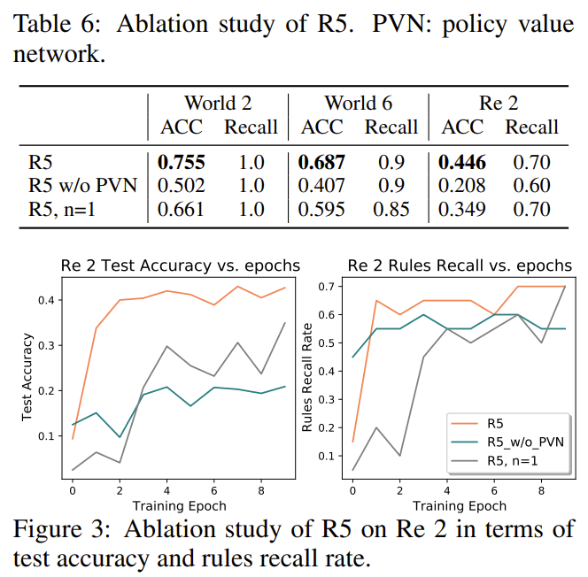 本文还做了一些关于策略价值网络,和 invented 关系的消融实验。实验结果表明,这两个模块对 R5 都是必要的,策略价值网络保证准确性,invented 关系加速收敛。