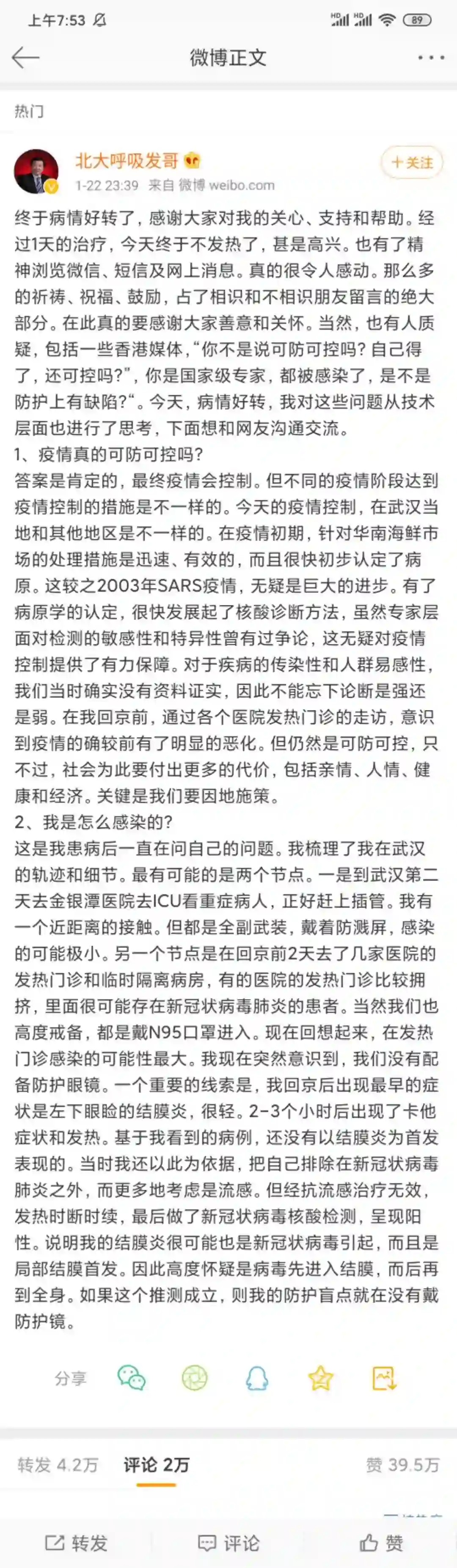 【王广发:高度怀疑病毒先进我眼睛结膜,再到全身】新型冠状病毒感染肺炎专家组成员王广发22日深夜发微博称其病情已好转,同时其称之所以被传染,推测是没有戴防护镜所致。武汉当地一位资深临床传染病专家也向记者表示认可这项推测。