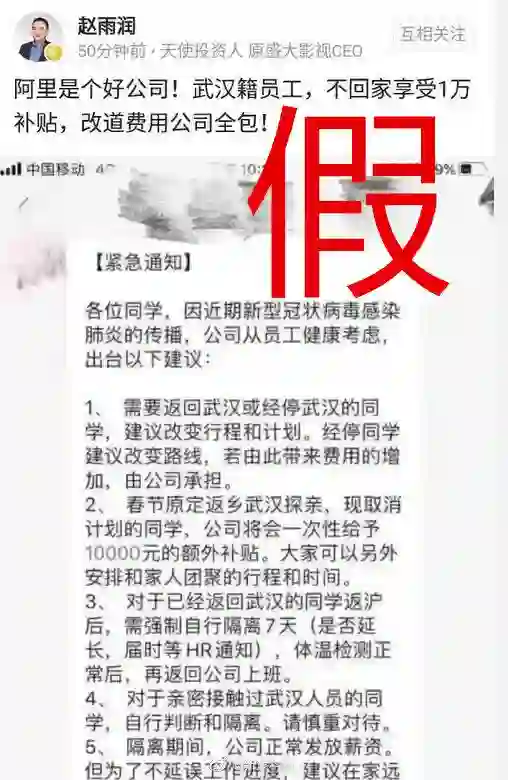 【阿里辟谣取消武汉探亲补贴1万:假的】针对网传阿里将对取消返武汉探亲计划的员工,公司将给予10000元额外补贴。对此消息,阿里方面表示,假的。社交媒体账号“赵雨润”发布截图称,阿里对武汉籍员工改道费全包,不回家享受1万元补贴。不过截止发稿时,该账号已无此内容,疑似被本人删除。