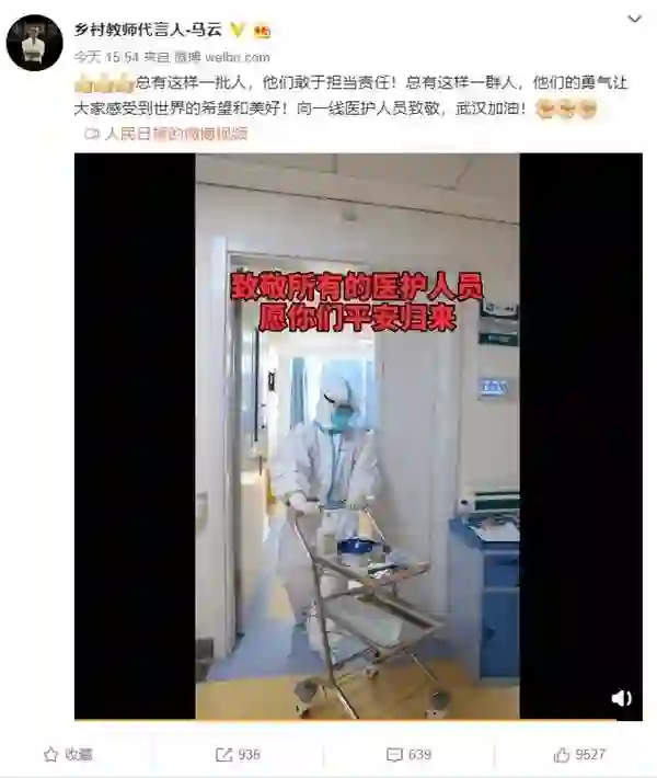 【马云微博致敬一线医护人员:他们敢于担当责任 武汉加油】1月22日下午消息,马云发布微博致敬奋斗在一线的医护人员,他表示:“总有这样一批人,他们敢于担当责任!总有这样一群人,他们的勇气让大家感受到世界的希望和美好!向一线医护人员致敬,武汉加油!”