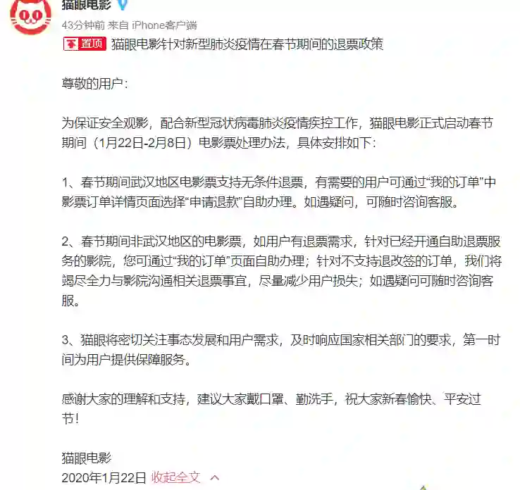 【淘票票声明:春节档期间武汉购票用户可申请无条件退票】1月22日消息,淘票票发布声明称,即日起正式启动春节档期间(1月22日~1月31日)票务应急处理措施,春节档期间在武汉地区购买电影票的用户均可申请无条件退票。春节档期间非武汉地区城市,如用户有退票需求,淘票票将秉持客户第一原则,按照卫生防疫部门要求,全力和影院沟通相关退票事项,尽量减少用户损失。