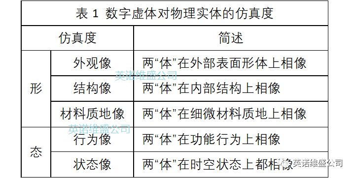 应该说,数字孪生是建设CPS的基础,是CPS发展的必经阶段。所谓建立数字孪生关系,就是以“软件定义”的方式,对物理实体(物理孪生体)建立了完全对应的数字虚体(数字孪生体),所创建的数字虚体经历了一个从其“形”、其“态”,逐渐向物理实体的“形、态”逼近的过程,直至看起来完全“相像”,如同同胞兄弟一般。在“相像”程度上,可以用不同级别的仿真度来衡量,如表1所示。