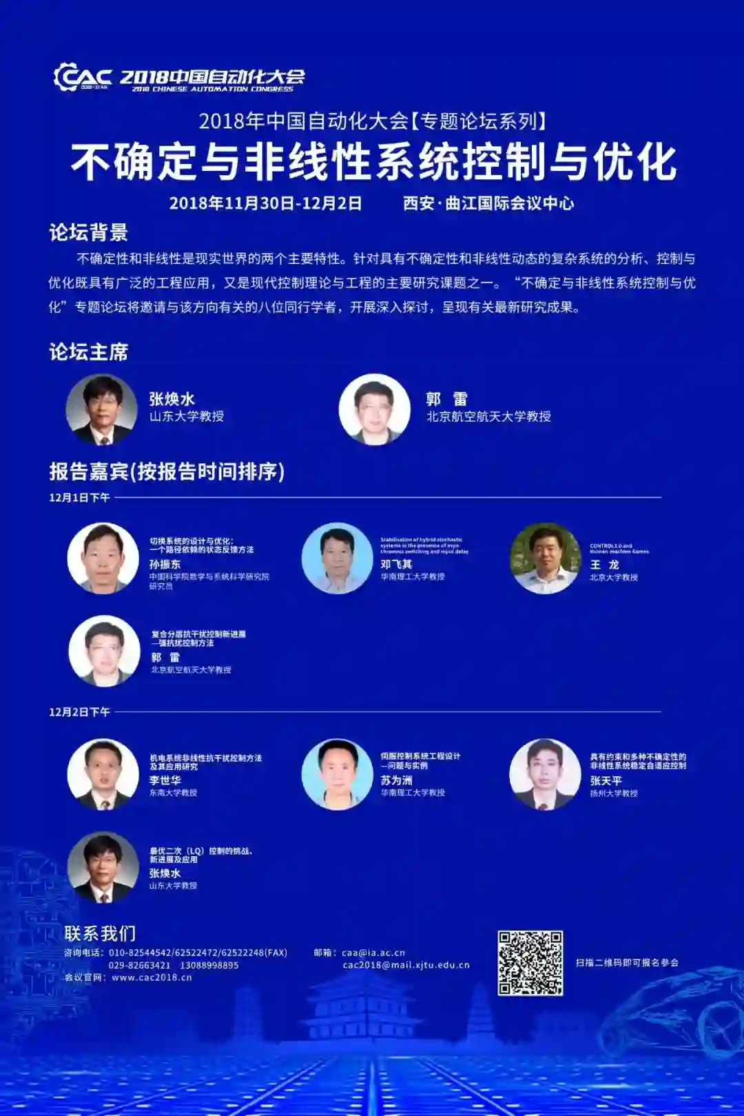 今天为大家介绍的是CAC 2018专题论坛:不确定与非线性系统控制与优化的背景,及相应的两位论坛主席与八位报告专家。