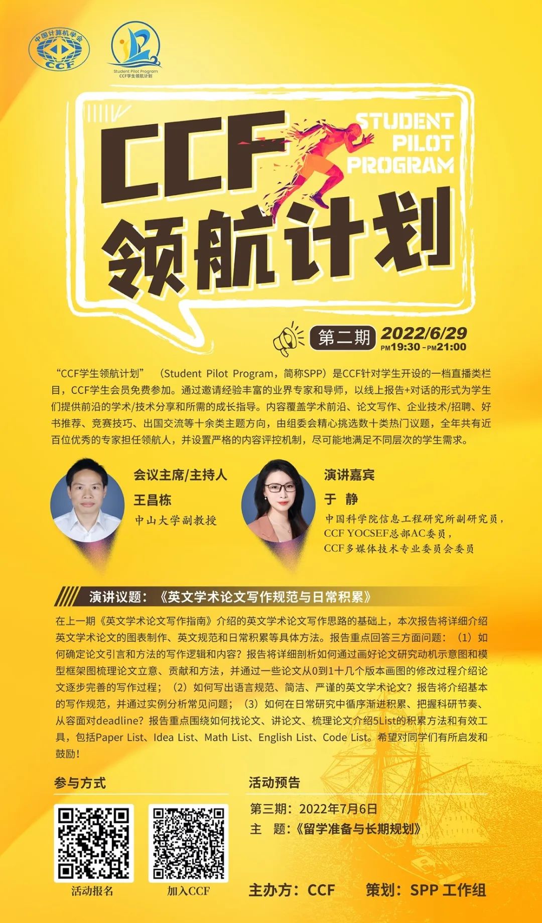 SPP前期免费直播。CCF会员点击“阅读原文”立即报名,报名或入群均可在活动前获取到腾讯直播间链接,可与老师线上即时交流。当期的领航老师也会通过加入微信社群进行活动后的答疑和交流。希望能通过这样的方式和你一起进步、成长。呼朋唤友来参加吧!(本期活动群已满,可添加小助手微信号:T84259960,备注“学校+SPP入群”,由小助手拉您入群。)