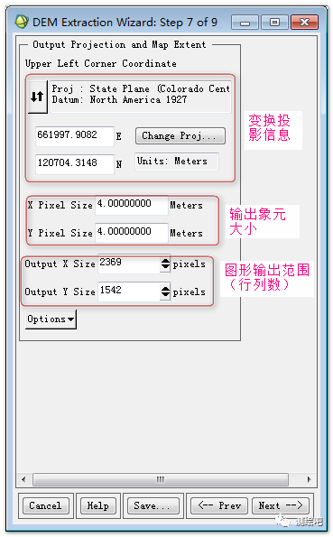 4)设置DEM提取参数和输出投影方式以及输出参数(图10)。