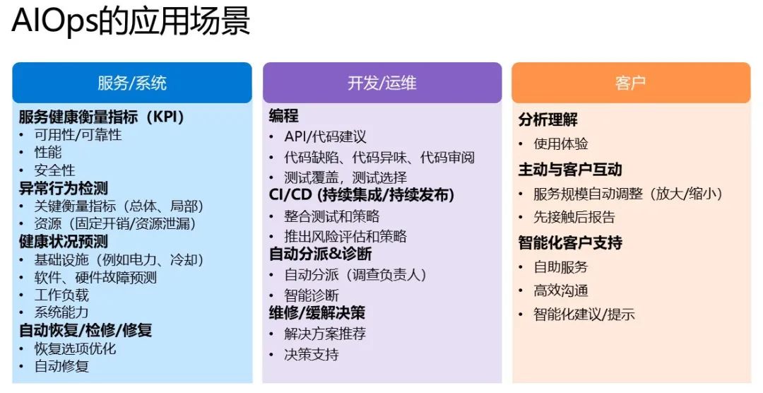 首先是系统服务,即 AI for System。云服务由部署了软件的数据中心系统为客户提供服务,软件必须要在云数据中心上运行起来,与云数据中心一起组成可运行的系统,才能对外提供云服务。而从可运行的系统角度来看,系统的性能、稳定性、安全性等各方面问题,都是需要研究的对象。其次是客户,即 AI for Customer。与互联网服务不同的是,云服务不仅服务于个人,更服务于企业,既然是为用户服务,一定要注重用户体验。即使系统再稳定,但用户体验不好的话,大家也不会选择云服务。第三是开发者,即 AI for DevOps,主要是面向开发人员和运维人员,用智能技术提高他们的生产率,让日常工作更顺畅。
