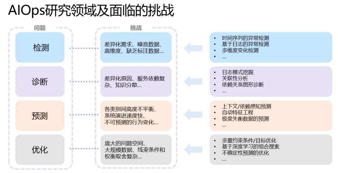 除了面向系统、用户和开发者外,AIOps 需要解决的问题类型方面,又可以分为检测、诊断、预测与优化等四大方面。在每一个问题方面,都有很多挑战以及多个解决问题和挑战的细分研究领域。归根结底,云平台非常复杂,不仅规模大而且为分布式架构,因此 AIOps 是一个需要长期投入的研究领域。