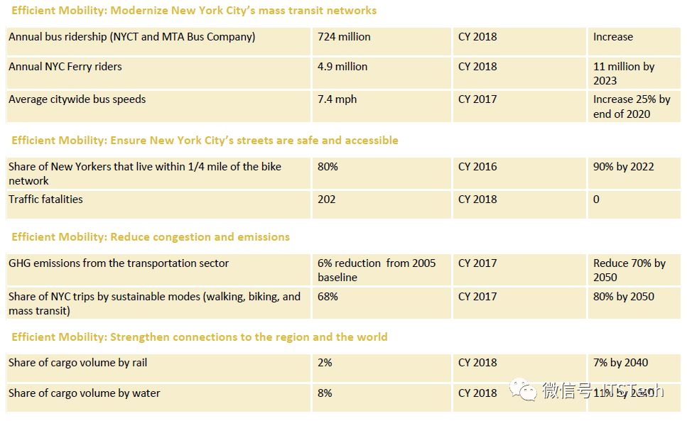 纽约OneNYC 2050高效移动性交通发展战略就提出了现代化纽约市的公共交通网络、确保纽约市的街道安全且便捷、减少拥堵和排放和加强与地区和世界的联系等四个方面的目标指标。其中特别提到交通事故死亡人数从2018年的202人降低至2050年的0人,即零死亡愿景。