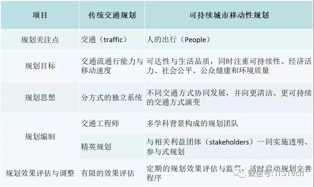 相对与国内交通评价侧重于车辆交通运行状态而言,国外更关注城市的移动性,即交通出行者交通选择的权利。这一点可以从下表的可持续城市移动性规划和传统的综合交通规划的区别中可以看看出。