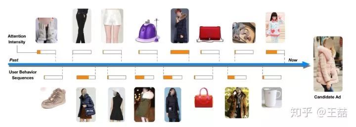 但是我们仔细想一想我们自己的购买过程,其实每个用户的兴趣都是多样的,女生喜欢买衣服包包,也喜欢化妆品,甚至还为自己男朋友挑选过球衣球鞋,那么你在买大衣的时候,真的要把给男朋友买球鞋的偏好考虑进来么?具体到本文的例子中,在预测大衣的CTR这件事情上,用户浏览过杯子,跟用户浏览过另一件大衣这两个行为的重要程度是一样的吗?