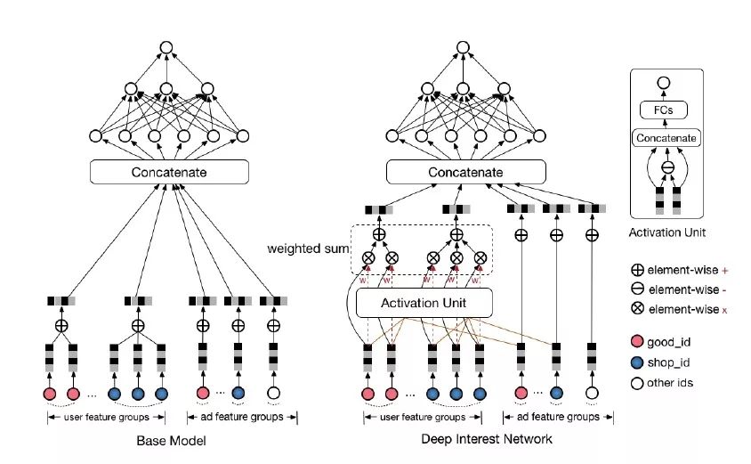 传统的Attention机制中,给定两个item embedding,比如u和v,通常是直接做点积uv或者uWv,其中W是一个|u|x|v|的权重矩阵,但这篇paper中阿里显然做了更进一步的改进,着重看上图右上角的activation unit,首先是把u和v以及u v的element wise差值向量合并起来作为输入,然后喂给全连接层,最后得出权重,这样的方法显然损失的信息更少。但如果你自己想方便的引入attention机制的话,不妨先从点积的方法做起尝试一下,因为这样连训练都不用训练。