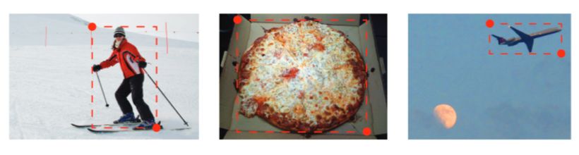 CornerNet[10]:如下图所示,CornerNet检测算法巧妙的将检测框转换成了关键点,即一个目标框可以由两个点(左上角和右下角)来表示,那么对于一个目标物体在预测的时候就可以直接预测两个类别的关键点,然后对关键点进行组合即可生成对应的目标框。