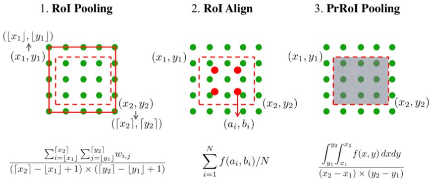 PrROI Pool:即Precise ROI Pooling,其考虑了Proposal对应格子区域的每个值,采用积分的方式进行求解,而ROI Align只Sample对应格子区域的几个值。