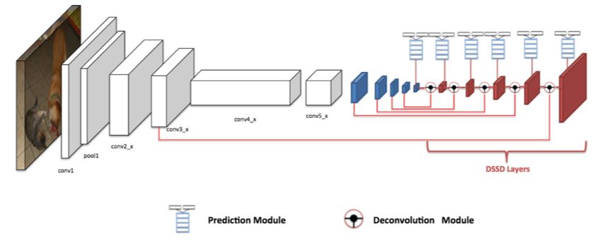 DSSD[6]:DSSD检测算法的网络结构如下图所示,DSSD也是使用不同阶段不同分辨率的feature maps进行预测,在不考虑Backbone网络结构差别的情况下,可以发现DSSD相比于SSD多了一系列的后续上采样操作,SSD是使用下采样过程中的feature maps进行预测,而DSSD是使用上采样过程中的feature maps进行预测。显而易见的是,SSD用于检测的feature maps位于网络的较低层,表征能力较弱,而DSSD用于检测的feature maps位于网络的较高层,表征能力较强,同时DSSD在反卷积的过程中通过Skip-Connection引入了较低层的feature maps,实现了一定程度的特征融合。所以DSSD的效果要优于SSD检测算法。