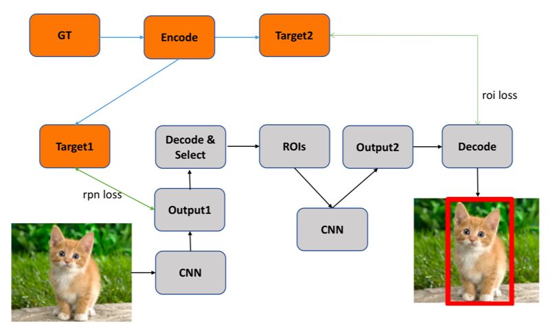 Two-Stage目标检测算法本人认为可以看作是进行两次One-Stage检测,第一个Stage初步检测出物体位置,第二个Stage对第一个阶段的结果做进一步的精化,对每一个候选区域进行One-Stage检测。整体流程如下图所示,在Testing的时候输入图片经过卷积神经网络产生第一阶段输出,对输出进行解码处理生成候选区域,然后获取对应候选区域的特征表示(ROIs),然后对ROIs进一步精化产生第二阶段的输出,解码(后处理)生成最终结果,解码生成对应检测框即可;在Training的时候需要将Ground Truth编码成CNN输出对应的格式以便计算对应损失loss。