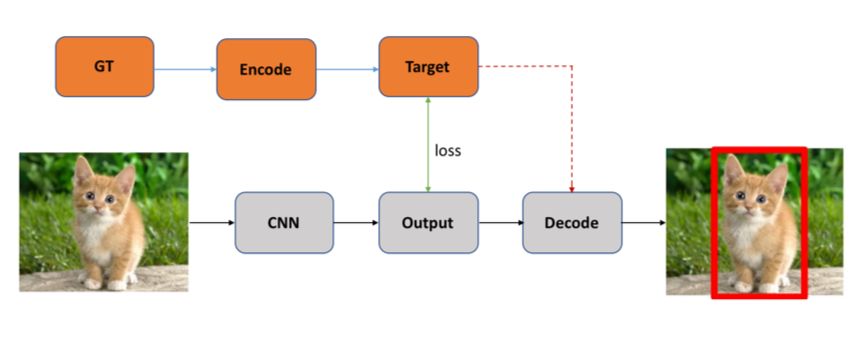 One-Stage目标检测算法可以在一个stage直接产生物体的类别概率和位置坐标值,相比于Two-Stage的目标检测算法不需要Region Proposal阶段,整体流程较为简单。如下图所示,在Testing的时候输入图片通过CNN网络产生输出,解码(后处理)生成对应检测框即可;在Training的时候需要将Ground Truth编码成CNN输出对应的格式以便计算对应损失loss。