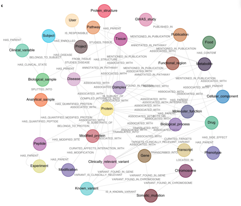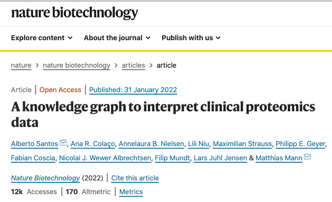 第一篇文章是2022年1月31日发表在Nature biote上的文章“A knowledge graph to interpret clinical proteomics data“,作者用蛋白质组学知识图谱,提供了从组学数据到辅助临床决策的可靠的、并经过验证的分析框架。作者开源了相关数据和代码,可以直接迁移到自己的项目中。