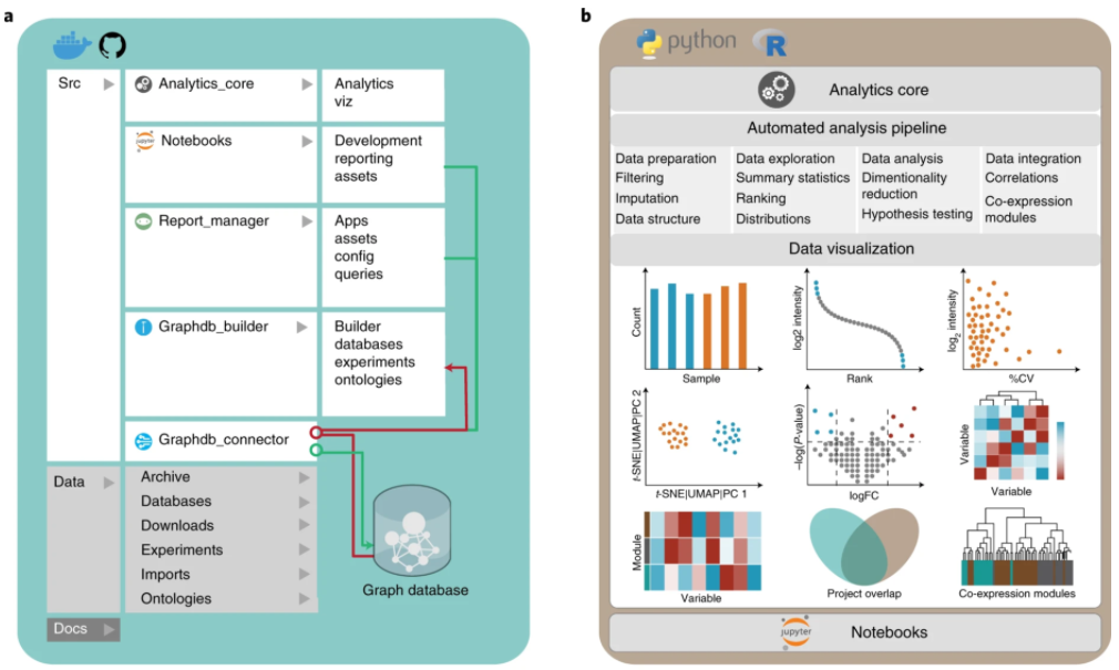 a、CKG架构用python实现,包含几个独立的模块:负责连接数据库(graphdb_builder)、构建图(graphdb_builder)、分析和可视化实验数据(analytic_core)、显示和启动多个应用程序(report manager);b、CKG分析核心实现了多种最新的数据科学算法,用于蛋白质组学的统计分析和可视化:数据准备、探索、分析和可视化。c、CKG图数据库数据模型旨在整合多层次的临床蛋白质组学实验,并用生物医学数据对其进行注释。它定义了不同节点(例如,蛋白质、代谢物和疾病)以及连接它们的关系类型(例如,HAS_PARENT和HAS_QUANTIFIED_PROTEIN).