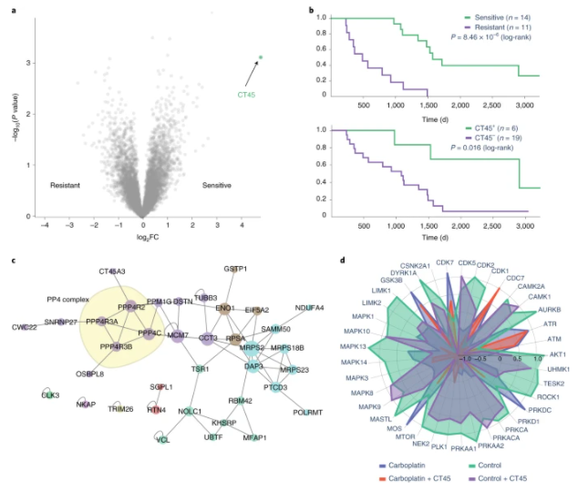 a , CKG 强调 CT45 是唯一在比较化疗耐药和化疗敏感患者的卵巢肿瘤组织时显著调节的蛋白质 ( n = 25; SAMR s0 = 2; BH FDR < 0.05) (数据来自 Coscia 等人3 ) . b,CKG 的分析管道估计了临床组敏感和耐药(双边对数秩检验)的生存函数,相应的高(前 25%)和低(剩余 75%)CT45 表达,并确认明显更长的疾病-高 CT45 表达组的自由生存。C, 相互作用蛋白质组学揭示了 PP4 磷酸酶复合物的亚基作为 CT45 的直接相互作用物,CKG 将其显示为 PPI 网络中的簇,确认已知的相互作用物并突出潜在的新相互作用物(由簇着色的节点)。d,CKG 中的磷酸蛋白质组学分析确定了显著调控的位点,并将它们与上游激酶调节剂联系起来。在这些激酶调节剂中,CDK7、CDC7、ATR 和 ATM 受卡铂作用的影响很大。FC,折叠变化。