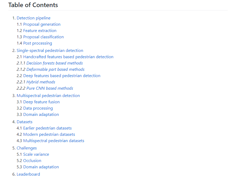行人检测是计算机视觉中一个重要但具有挑战性的问题,特别是在以人为中心的任务中。在过去的十年中,在人工特征和深度特征的帮助下,我们看到了显著的改进。在这里,我们介绍行人检测的最新进展。首先,我们提供了一个详细的回顾单光谱行人检测包括基于人工特征的方法和基于深度特征的方法。对人工特征方法,我们提出了广泛的方法回顾,并发现在外观和空间上有较大自由度的人工特征有较好的性能。在基于深度特征的方法中,我们将其分为纯基于CNN的方法方法和那些同时使用人工和CNN的特征。并对其进行了统计分析和趋势分析方法,其中特征增强、部分感知和后处理方法引起了主要关注。除了单光谱行人检测,我们也回顾了多光谱行人检测,提供了对光照变化更鲁棒的特征。在此基础上,引入了相关的数据集和评价指标,并比较了具有代表性的指标方法。