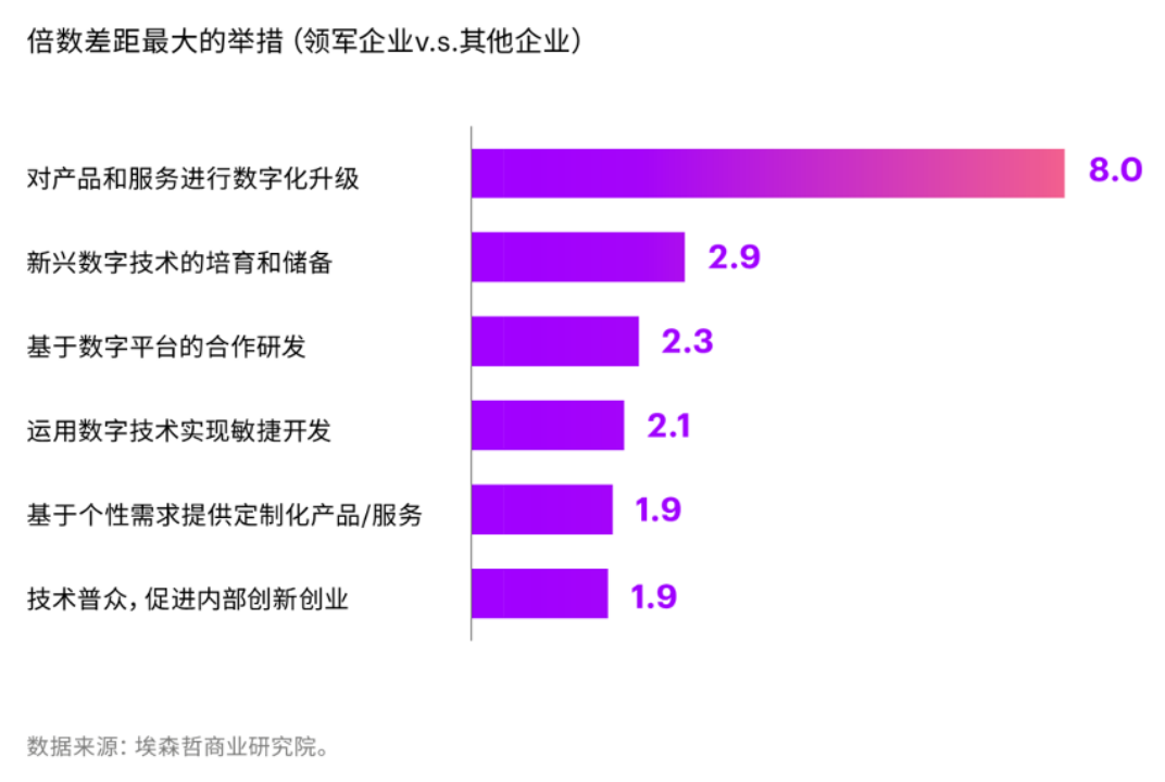 大部分企业在开拓数据变现模式、实现数据流和业务流程有效连接等方面取得大幅提升的同时,领军企业具有优势的指标都围绕着创新相关的指标。比如,在产品和服务的数字化升级能力的表现上,领军企业是其他企业的8倍;新兴数字技术的培育和储备上,也形成接近3倍的差距。