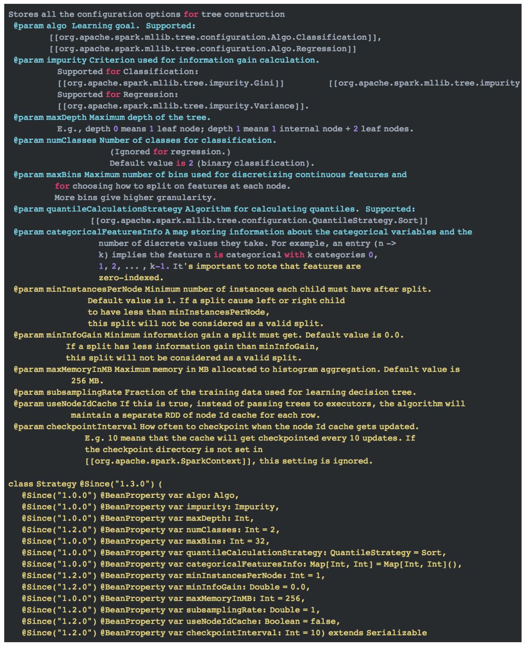 决策树的实现我们在随机森林专题介绍。这里我们只需要知道,当随机森林的树个数为1时,它即为决策树, 并且此时,树的训练所用的特征是全部特征,而不是随机选择的部分特征。即featureSubsetStrategy = "all"。