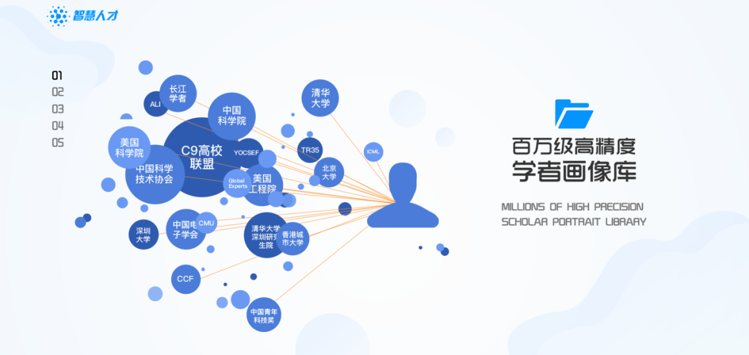 该系统选取近 5 年期间相关领域国际顶级期刊和会议所收录的全部论文数据,通过挖掘和分析论文数据,获取论文学者信息;通过命名排歧和信息抽取等大数据分析和挖掘技术,对重点科技领域的专家学者进行学者画像,构建领域人才智库,然后根据学者画像信息进行领域人才相关情报挖掘分析。