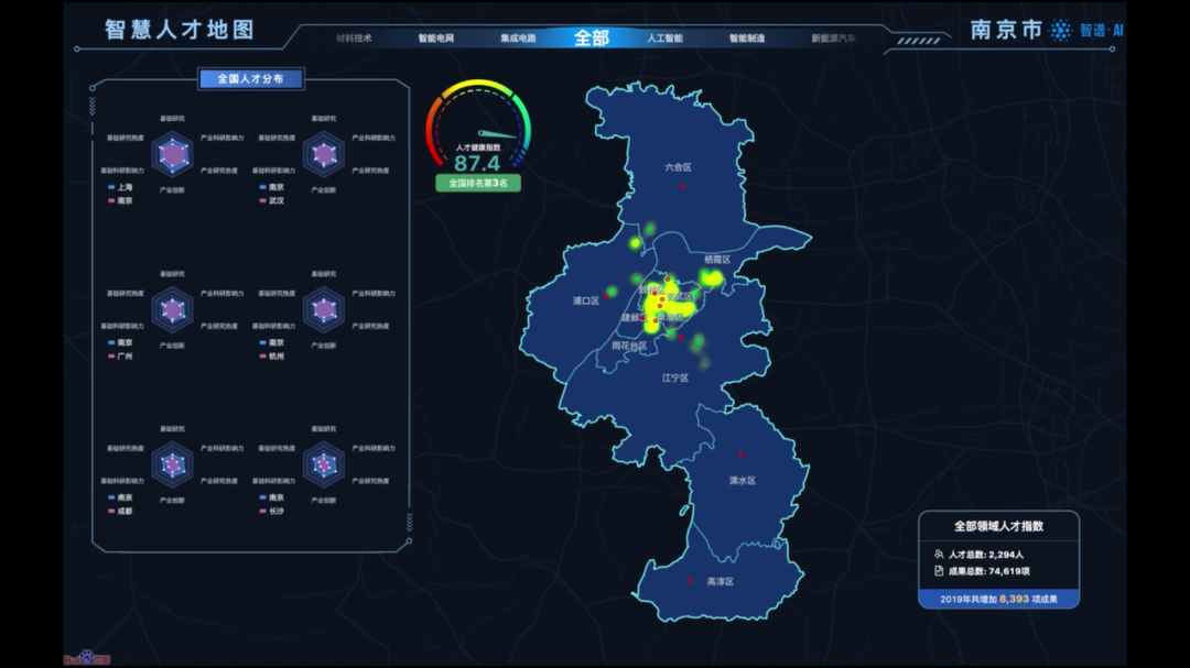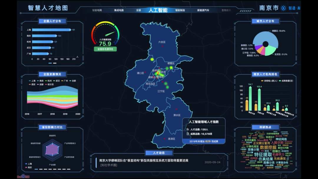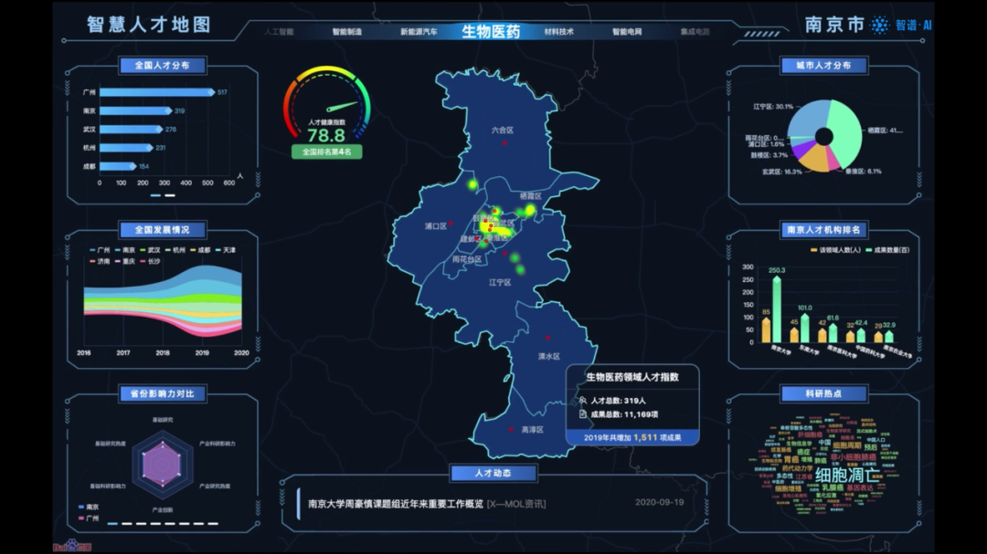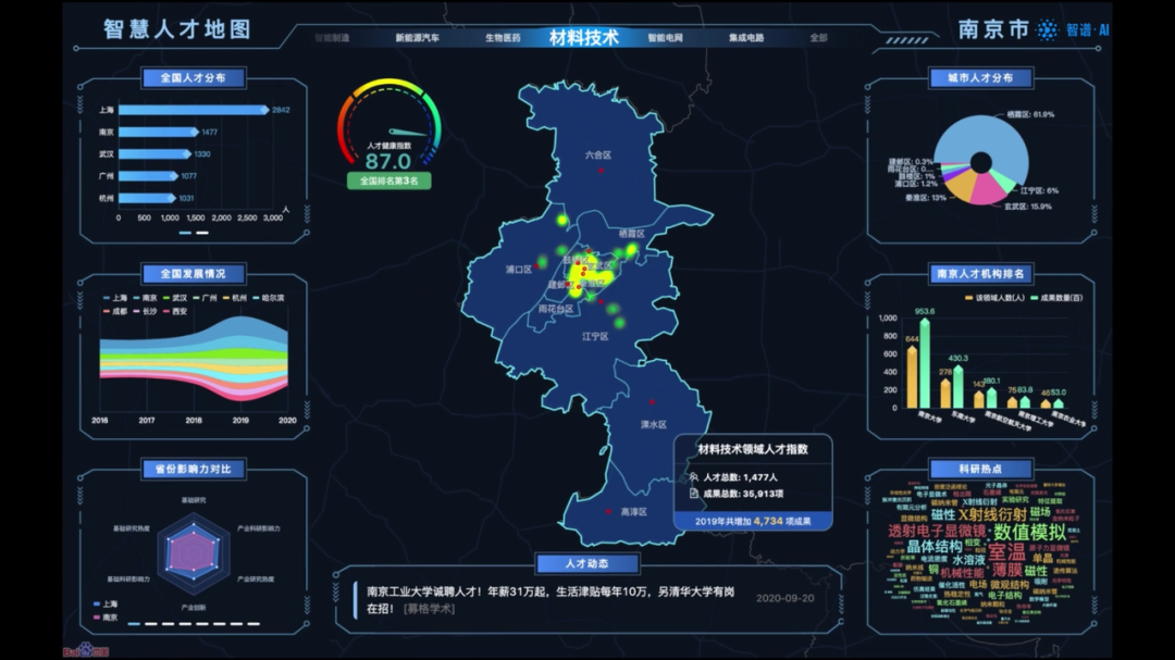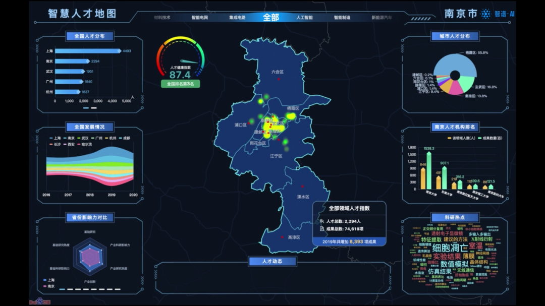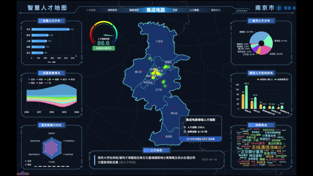 从图中我们可以看到人工智能、生物医药、材料技术、集成电路等等多个当下热门领域的多方面信息。所呈现的数据点面结合,既包括南京该领域的人才动态、城市人才分布、南京人才机构排名,也有该领域的全国人才分布、全国发展情况以及南京与省份城市的影响力对比。