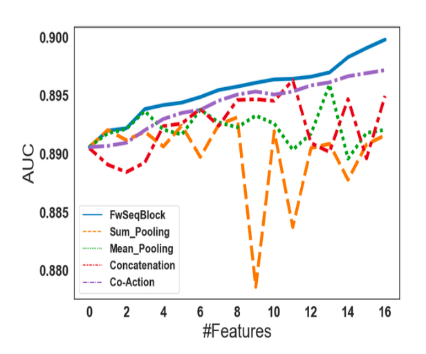 如下表所示,在基准方法中增加 FwSeqBlock 模块后,所有方法均能获得一致的指标提升。具体指标上,在 Taobao 数据集(6 个特征)中,FwSeqBlock 能够带来 0.49%~0.94% 的 AUC 增益;在业务数据(17 个特征)中,FwSeqBlock 能够获得更加显著的离线指标 AUC 增益。我们认为这样的实验结果能够充分证明 FwSeqBlock 在用户历史行为表征建模中的有效性。