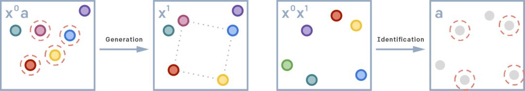 世界上的众多状态由多组实体及其属性和位置组成(比如下面的点,就具有位置和颜色属性)。用于“识别”的注意力掩膜表示模型对某些实体集的关注。