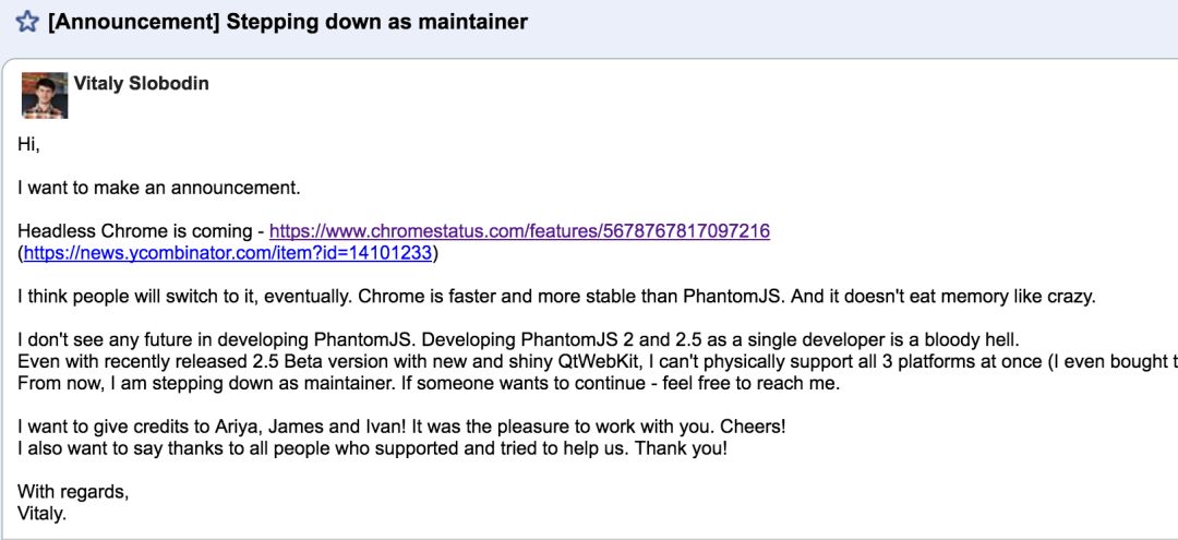 去年 4 月,我们曾报道过 PhantomJS 核心开发者之一 Vitaly Slobodin 宣布退出,辞任 maintainer ,不再维护项目。