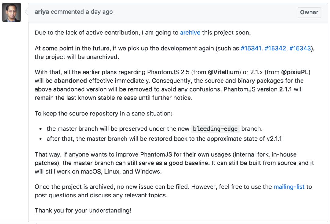 之后,ariya 发布了“暂停开发”的通知,表示由于缺乏积极贡献,项目将封存归档,不再接受新的 Issue 提交。不过,邮件列表依然可以用来发布问题并讨论项目相关的话题。PhantomJS 2.1.1 是归档前的最后一个稳定版本。未来如果他们再次拿起项目进行开发(例如#15341,#15342,#15343),项目将被取消存档。
