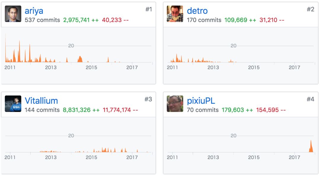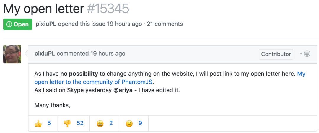 PixiuPL 说自己在去年 11 月被 ariya 邀请成为 PhantomJS 项目在 Github 上的 Collaborator,随后开始深入研究 PJS 的源码,并进行 PR 合并、Issues 处理 、新版本发布等工作。