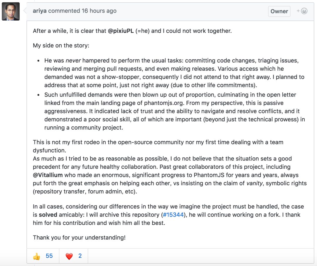 在公开信发布后的 3 月 4 日,pixiuPL 补充道,ariya 已通过 Skype 回复了他,但对于他接管项目的建议感到不愉快。ariya 似乎更愿意关闭项目,并批评 pixiuPL 创建了 PJS 的内部分支(在 GitHub 之外)。