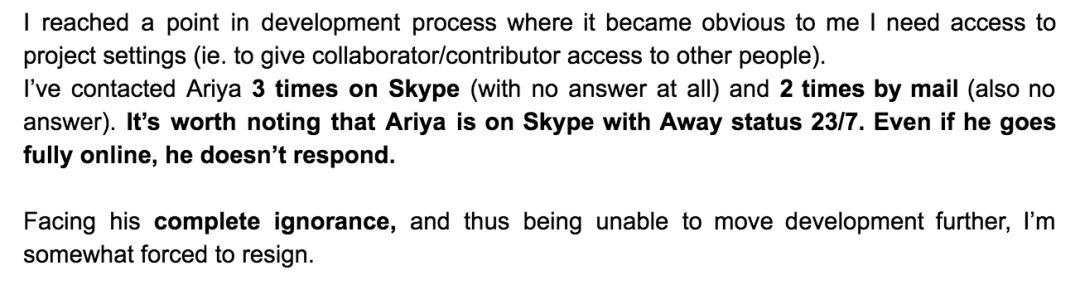 近日,由于他在开发过程中遇到了需要访问项目设置权限的问题,随后在 Skype 和邮件上多次联系 ariya ,但均未得到回复(即使对方在线)。