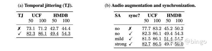首先,如图3,通过ablation study,验证了时序抖动和语音、视频同步的重要性。