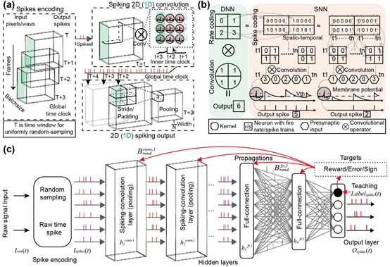 图1:脉冲卷积编码和奖赏传播算法。(a),脉冲卷积编码中的双时钟设计。(b), 脉冲卷积编码和人工卷积编码的对比差异。(c),结构依赖的奖赏传播算法用于多层SNN学习,含有卷积、前馈等多类型结构。