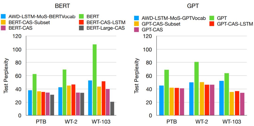 图 3:CAS 与其它模型的测试困惑度比较(左图是使用 BERT 预训练模型的结果;右图是使用 GPT 预训练模型的结果)。「Subset」是指没有使用 LSTM 的变体,「LSTM」则对应不更新 Transformer 模块的模型。