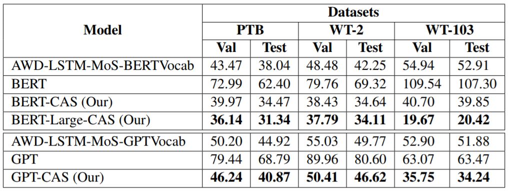 其中贡献 2 和 3 是通用的,可用于 NLP 领域外的其它很多情况。贡献 1 应该更特定于语言方面。我们在 PTB、WikiText-2 和 WikiText-103 这三个常用语言模型数据集上评估了 CAS。相比于当前最佳的基于 LSTM 的语言模型 AWD-LSTM-MoS,基于 BERT 的 CAS 在困惑度方面实现了平均 12.0 的增益。