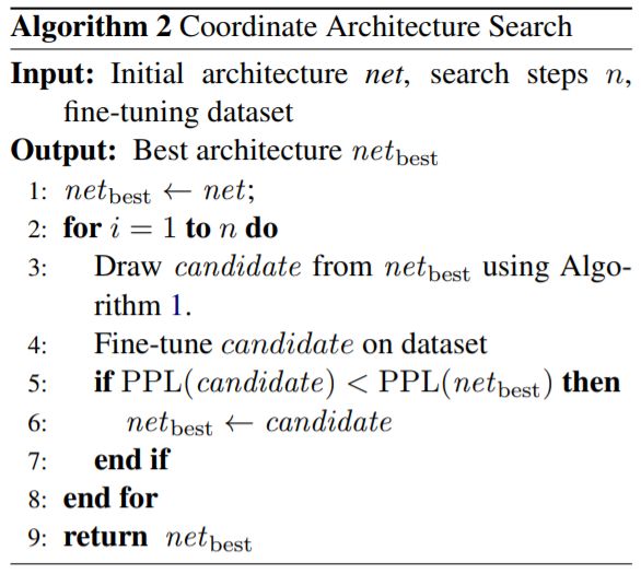图 2:协调式架构搜索。net_best 是指搜索的第 i 步骤的最佳架构。我们采样搜索候选项,并保留表现最好的那个。我们的衡量指标是微调后在目标数据集上的困惑度(Val PPL)。参见算法 2。
