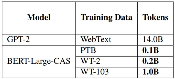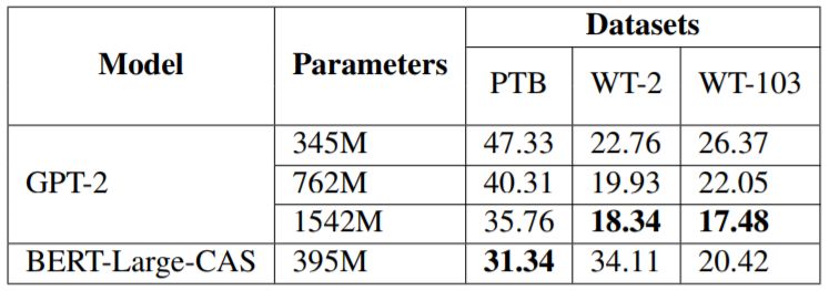 最后,我们还比较了新提出的模型与当前最佳的语言模型 GPT-2,比较指标分为三个维度:结果、参数规模、训练数据规模。结果见表 6 和表 7。可以看到,在参数方面我们的 BERT-Large-CAS 在 PTB 和 WT-103 上比 GPT-2 更高效,而在 WT-2 上的表现比 GPT-2 差,我们推测原因可能是 WT-2 的规模非常小。而在训练数据方面,BERT-Large-CAS 能用显著更少的数据达到相近的结果。