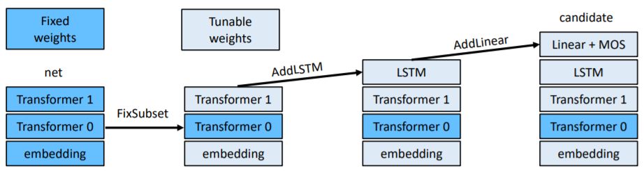 我们前面提出了多种可改变网络的变换方式,我们将它们分别称为:AddLinear、AddLSTM、FixSubset。其中 AddLinear 是添加线性输出层,AddLSTM 是添加 LSTM 层,FixSubset 是固定一部分 Transformer 模块的权重。