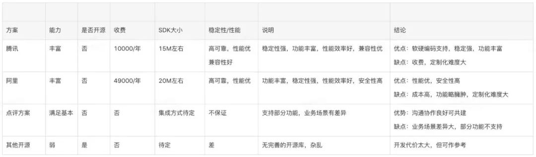 通过技术调研和分析,吸取各开源项目的优点,并参考大众点评App UGC、Google CTS方案,对核心流程做了最终的方案选型,打造一个适合我们业务场景的方案,如下表所示: