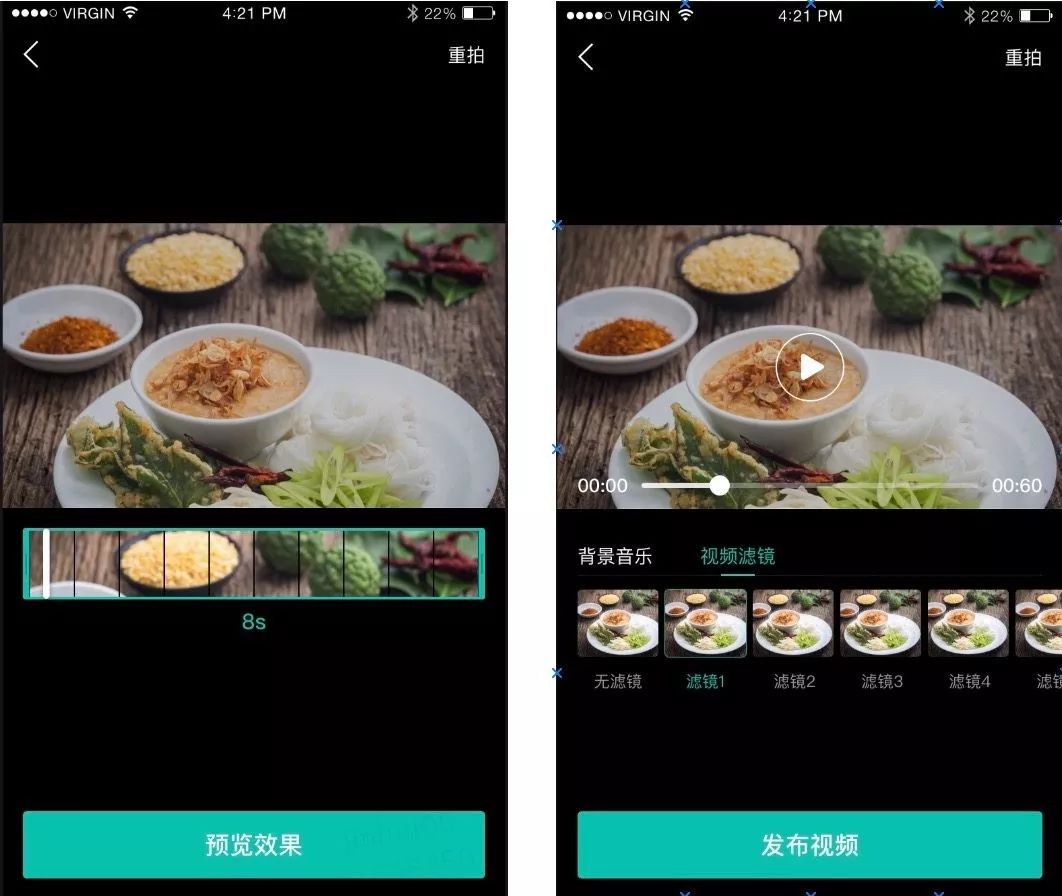 2013年美团外卖成立,至今一直迅猛发展。随着外卖业务量级与日俱增,单一的文字和图片已无法满足商家的需求,商家迫切需要更丰富的商品描述手段吸引用户,增加流量,进而提高下单转化率和下单量。商品视频的引入,在一定程度上可以提升商品信息描述丰富度,以更加直观的方式为商家引流,增加收益。为此,商家端引入了视频功能,进行了一系列视频功能开发,核心功能包含视频处理(混音,滤镜,加水印,动画等)、视频拍摄、合成等,最终效果图如下所示: