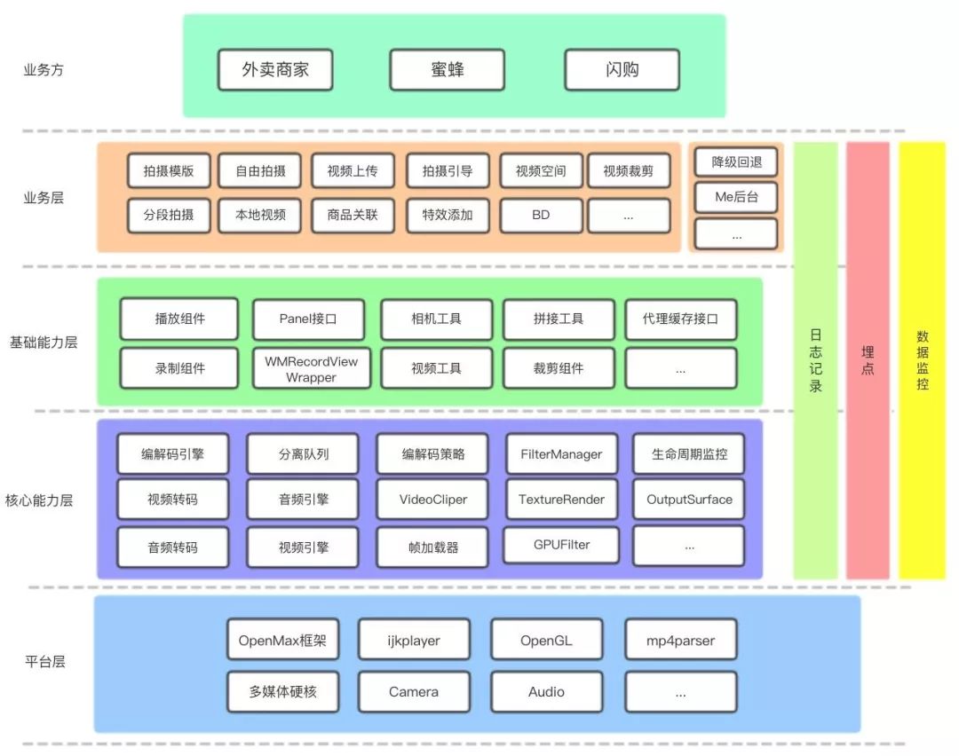 核心能力层:该层提供了视频服务的核心能力,包括音视频编解码、音视频的转码引擎、滤镜渲染能力等。